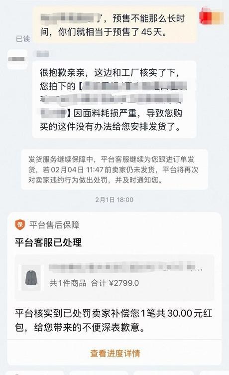 可到了承诺的发货日期,店铺却迟迟未发货。陈玉彤咨询客服,对方回答“货品未到仓库”。因为实在喜欢这件衣服,陈玉彤选择继续等待,直到2月初,距离下单已过去一个多月,客服告知:因面料短缺无法生产,提出赔偿30元优惠券,建议她主动退款。